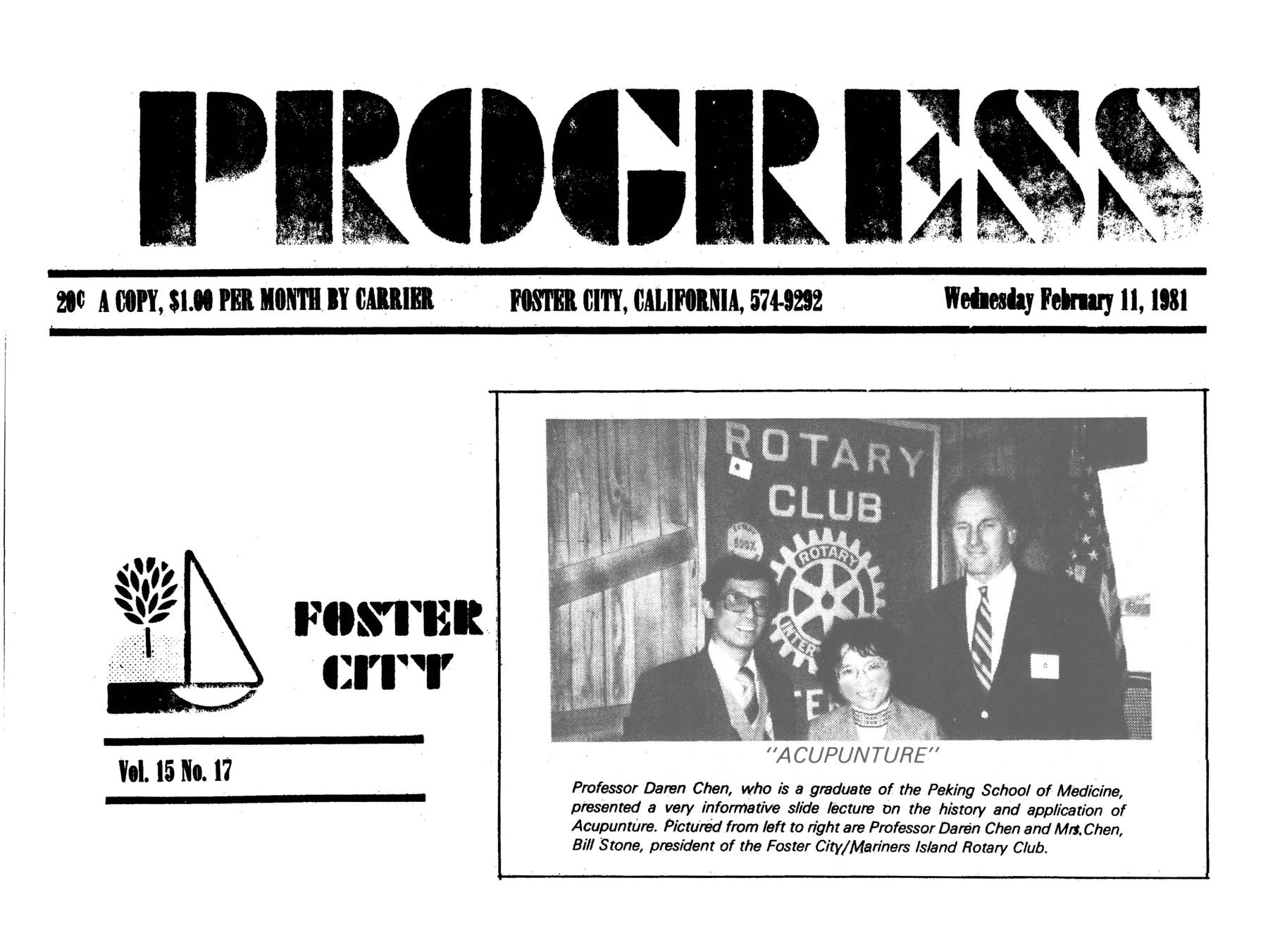 FEATURED IN FOSTER CITY PROGRESS 1981 Dr. Daren Chen and Dr. Sue Lin were invited by Foster City/Marina Islands Rotory Club to make a presentation on Acupuncture and Chinese medicine. Their lecture was wormly welcomed. Foster City newspaper the Progress had published a news release on this event.